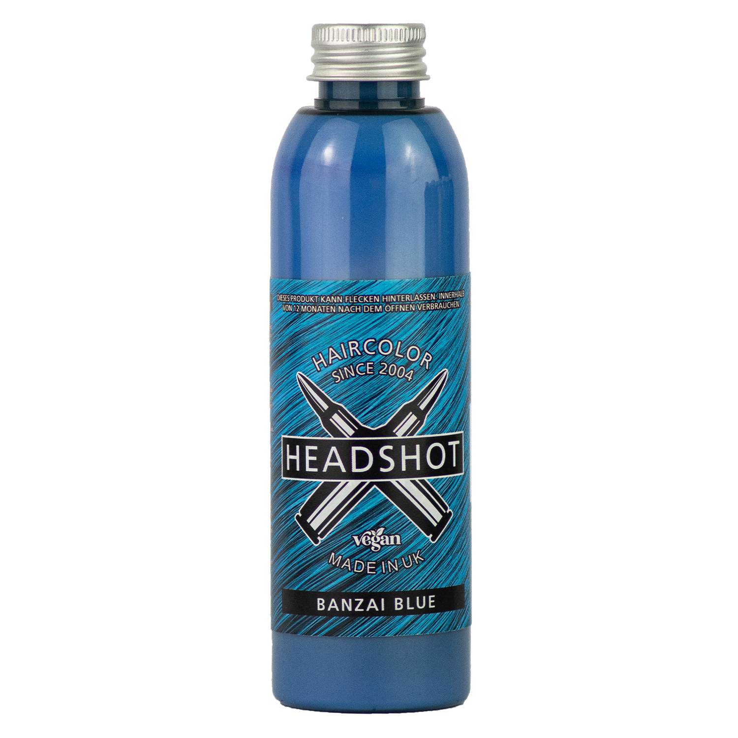 Mit 150 ml Inhalt ist in den Headshot Flaschen deutlich mehr Farbe enthalten als bei anderen Marken. Die Farbe ist vegan, tierversuchsfrei und wird in Europa hergestellt. Headshot "Banzai Blue" ist ein hellblauer Pastellton, keine deckende Haarfarbe.