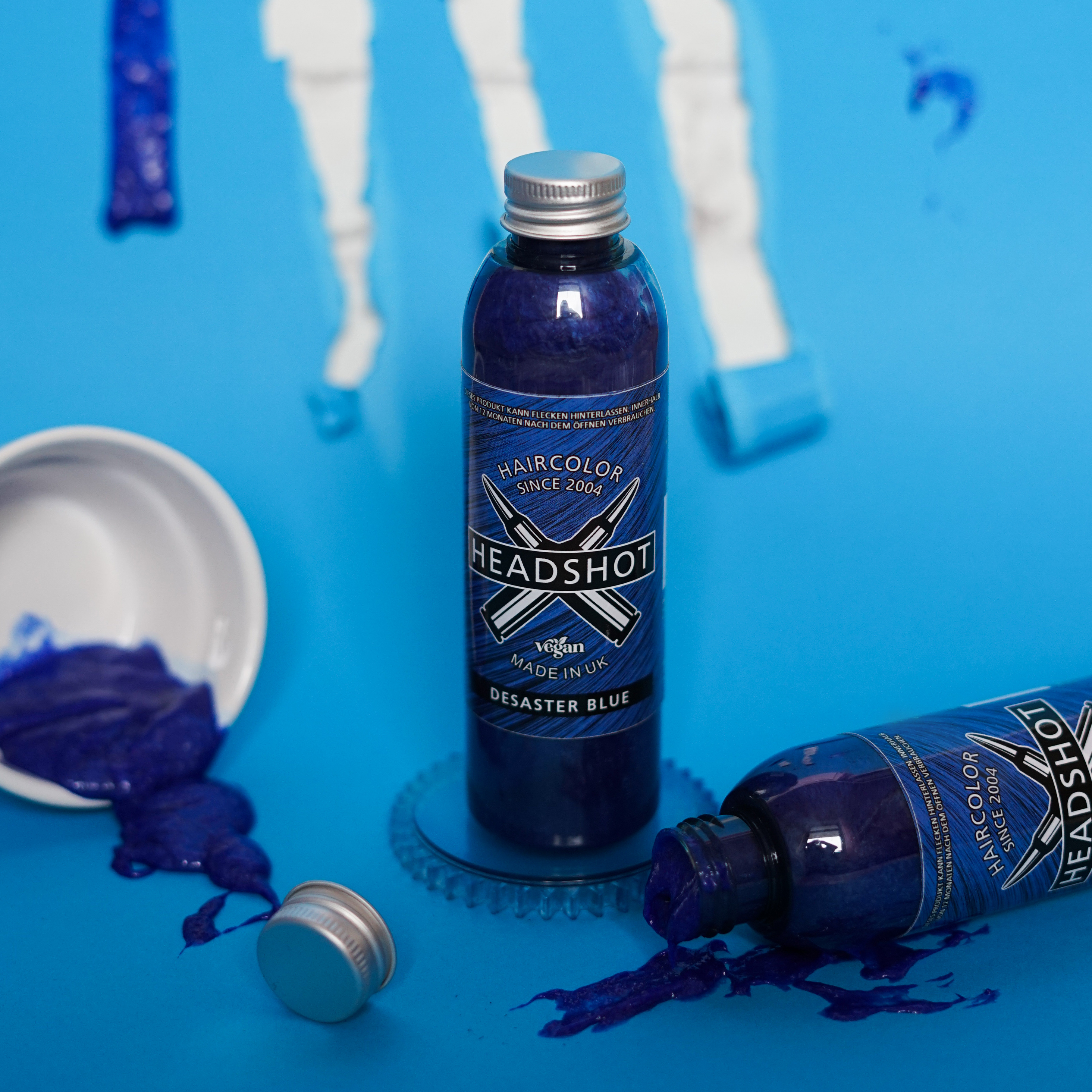 Im Falle eines Falles: Für den hoffentlich nicht eintretenden Fall, dass du etwas von der blauen Haarfarbe in deine Augen bekommst, bitte unverzüglich die Augen mit klarem Wasser ausspülen. Da die Headshot Haarfarbe Desaster Blue eine Haartönung ist, wäscht sie sich nach und nach aus. Wenn du dauerhaft diese unverschämt, göttlich anmutende, hellblaue Haarfarbe möchtest, musst du regelmäßig nachtönen. Übrigens kann es sein, dass deine Haare etwas auf dein Bettzeug abfärben, das ist nicht von langer Dauer, weil es ja wie gesagt eine Tönung ist, die sich wieder auswäscht.
