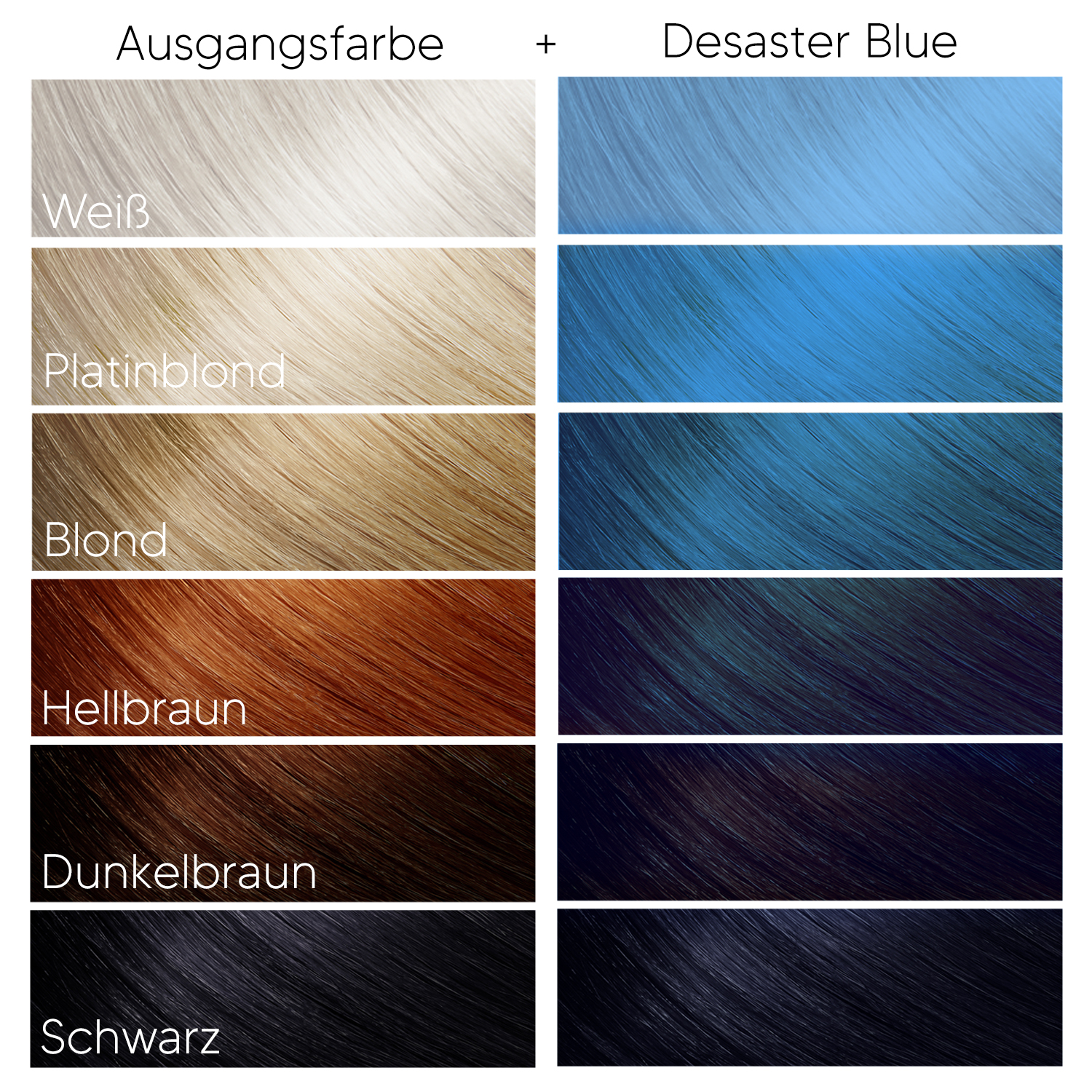 Desaster Blue ist ein helles Blau. Die Haare sollten vor dem Färben mit dieser Farbe sehr hell gebleicht werden und keinen Orange- oder Rotstich mehr enthalten. Wenn noch ein Gelbstich vorhanden ist, wird das Ergebnis Grün.