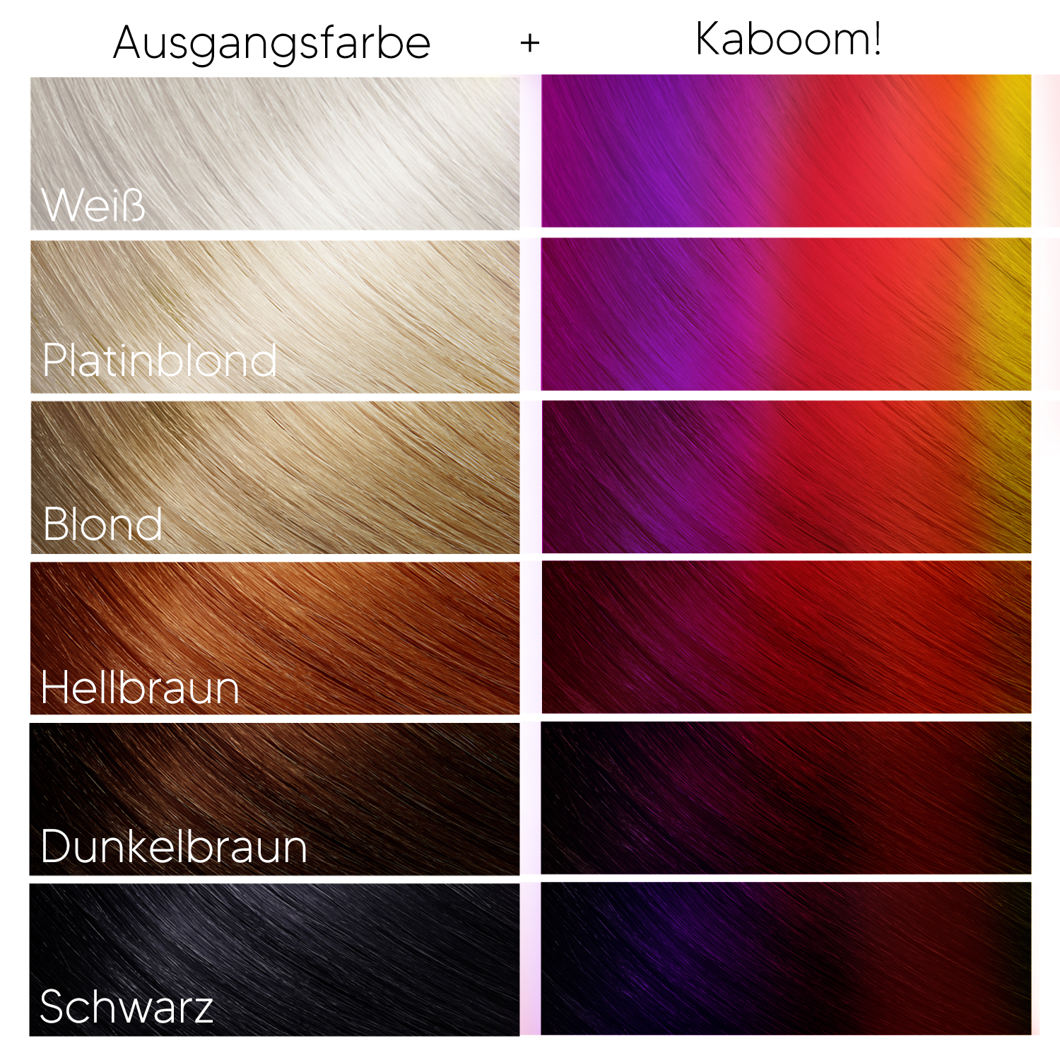 Endlich haben wir ein Set, mit allen Farben für Sunset-Hair. Das "Kaboom!" Set enthält alle sechs Headshot Haarfaben, die du für eine perfekte Farbexplosion benötigst: