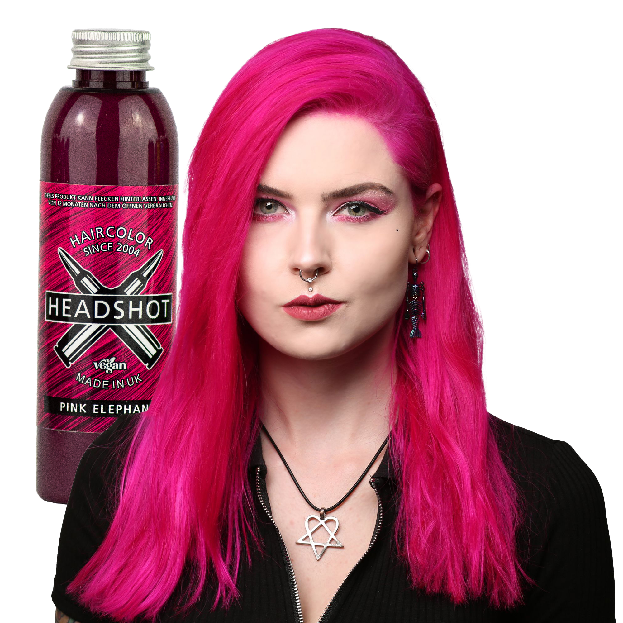 Aber auch auf unblondierten Haaren kannst du mit unserer Headshot Haarfarbe Pink Elephant erstaunliche Farbergebnisse erzielen. Je nachdem, wie dunkel deine Haare sind, wird das Ergebnis aber weniger leuchtend bis hin zu einem pinken Schimmer. Was du allerdings wissen solltest ist, wenn deine derzeitige Haarfarbe einen Rot- oder Orangestich hat, wird sich das auch an deiner Endhaarfarbe bemerkbar machen. Am besten, du färbst vorher eine Teststrähne.