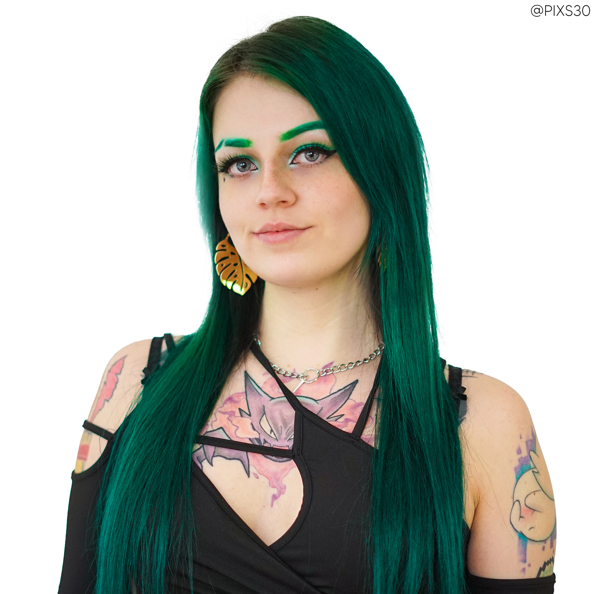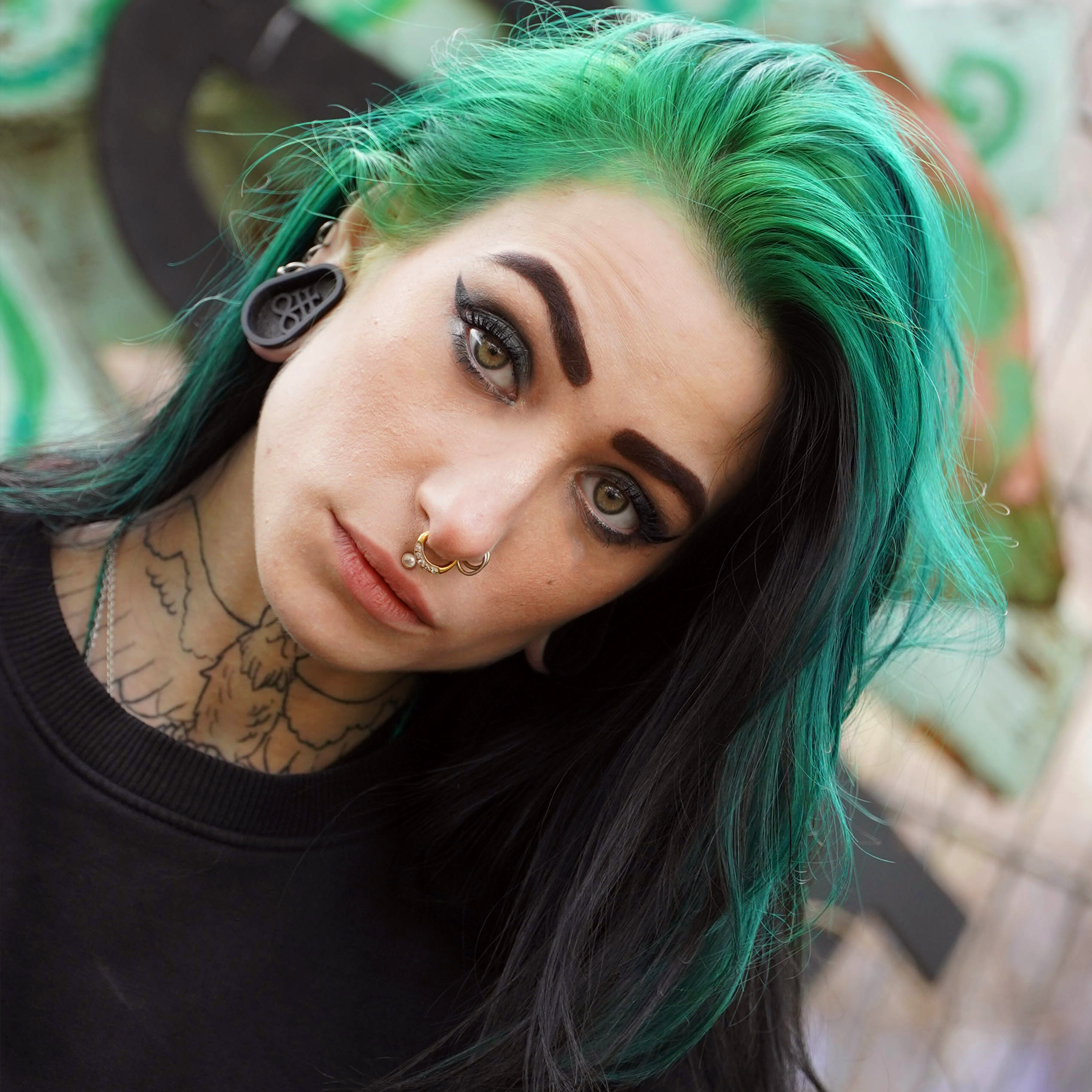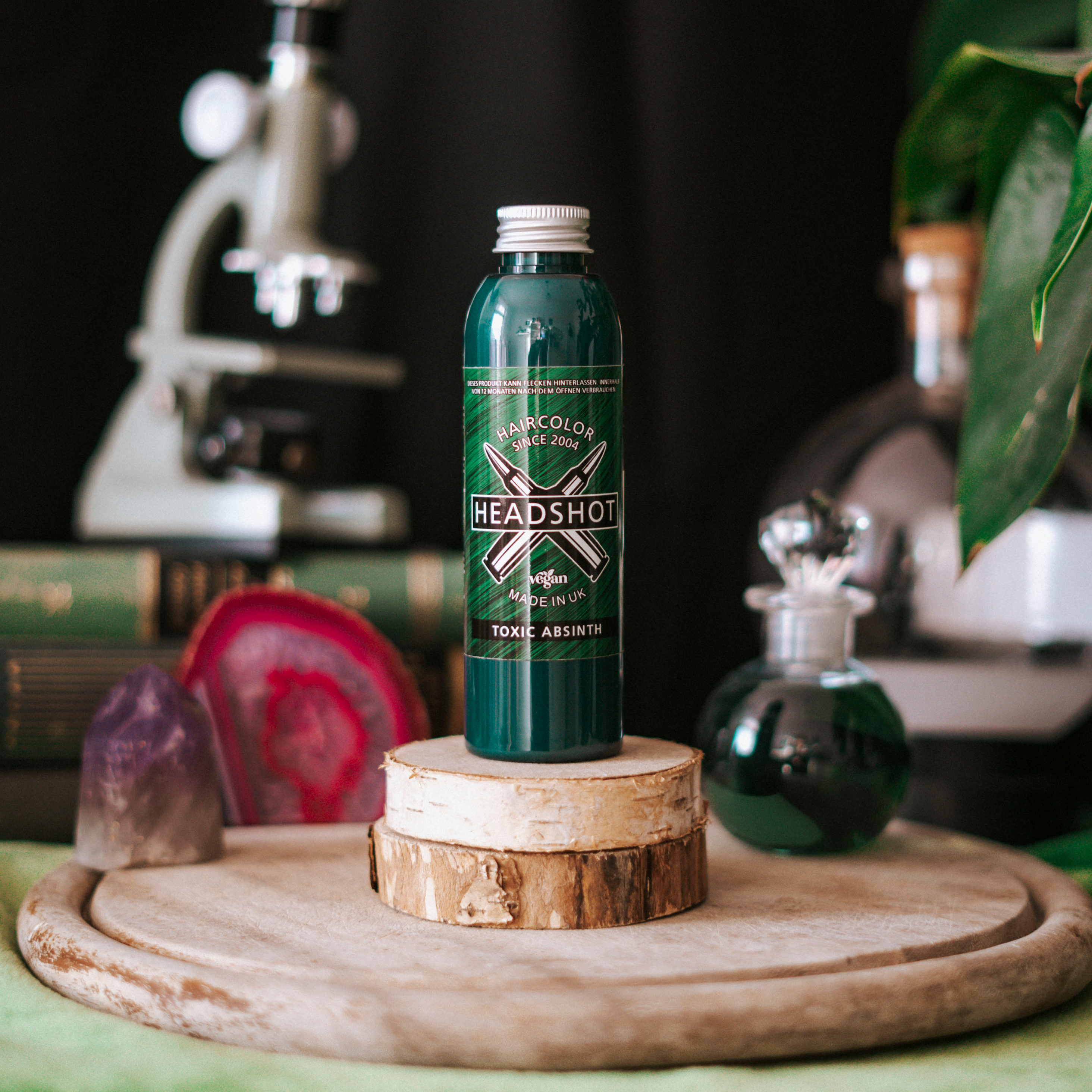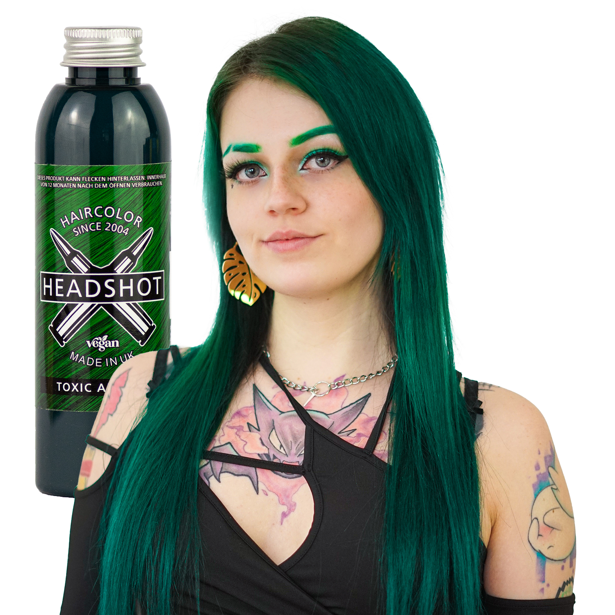 Unsere Haarfarbe Toxic Absinth ist etwas echt Besonderes. Dieser Grünton ist sehr dunkel und hat einen Blaustich. Auch hier gilt, willst du die absolute Farbexplosion, dann musst du deine Mähne blondieren. Auch der Blaustich wird extremer, je heller dein Haar ist. Dieser dunkle Grünton funktioniert aber auch auf nicht so stark aufgehelltem Haar. Und nun der absolute Hammer, dreh durch und klatsch in die Hände!!! Diese Headshot Haarfarbentönung ist auch für unblondiertes Haar geeignet. Ja, ist denn das die Möglichkeit? Alter Falter! Hier gilt je dunkler dein Haar, desto gedämpfter wird das Ergebnis. Wenn du dunkles Haar hast, erscheint lediglich ein mystischer grüner Farbschimmer. Wie du deine Haare korrekt blondierst findest du hier.