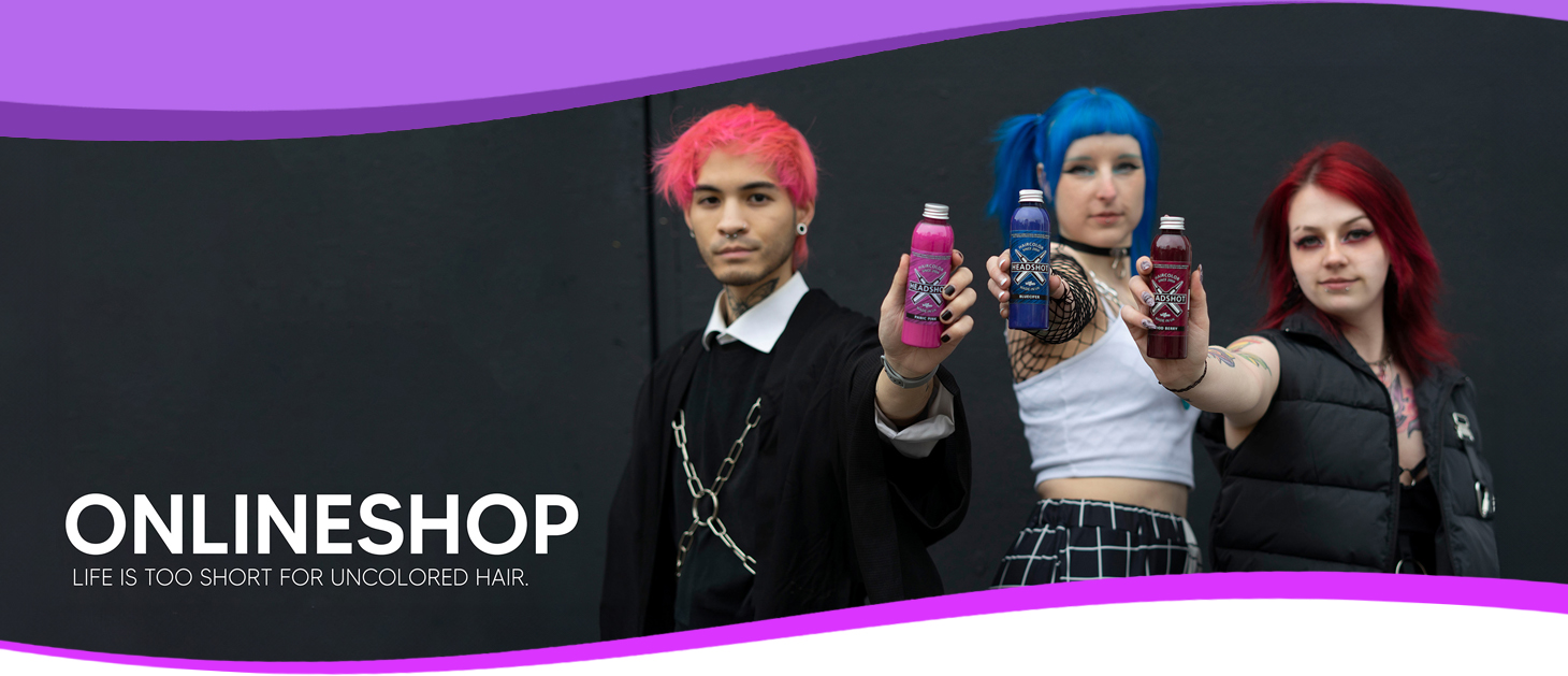 „Fuck you, I’m magic!“ ist ein Blauton mit leichtem Lilaanteil. Auf sehr hell blondierten Haaren kommt der Blauanteil besonders zur Geltung, bei gelbstichigen Haaren geht das Ergebnis eher ins Violette. Mit 150 ml Inhalt ist in den Headshot Flaschen deutlich mehr Farbe enthalten als bei anderen Marken. Die Farbe ist vegan, tierversuchsfrei und wird in Europa hergestellt. Für ein optimales Farbergebnis empfehlen wir folgende Vorgehensweise: Blondiere dein Haar. Je heller, desto besser. Warte 48 Stunden und zwei Haarwäschen. Feuchte die Haare an und lasse sie ca. 10 Minuten im Handtuch trocknen. Schütze die umliegende Haut mit Babyöl, Vaseline oder Creme. Achtung: Tönung kann Haut und Textilien verfärben. Die Haare Strähne für Strähne satt bestreichen. Benutze Einmalhandschuhe und einen Haarfärbepinsel, beides gibt es in der Drogerie. 30 Minuten oder länger einwirken lassen. Wärme verbessert das Ergebnis. Benutze vor dem Färben keine Pflegeprodukte wie z.B. silikonhaltige Shampoos, sonst wird möglicherweise die Farbe schlechter angenommen. Du kannst die Farben einer Marke auch mischen. Haartönungen sind nicht für Augenbrauen oder Wimpern gedacht, Augenkontakt unbedingt vermeiden! Die Tönungen waschen sich nach und nach wieder aus. Verfärbungen auf Textilien auch nach dem Tönen möglich! Die Farbergebnisse können varieren. Wir empfehlen daher, an einer geeigneten Haarsträhne einen Test durchzuführen, bevor du die Farbe auf das gesamte Haar aufträgst.